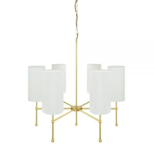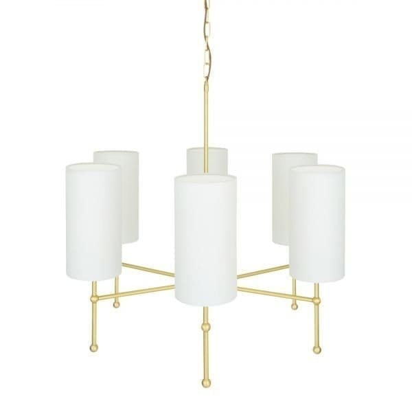 The Arizona chandelier is a modern chandelier with six arms that each hold tall, narrow fabric lamp shades. A central brass tube holds a brass cylindrical centre with six arms protruding horizontally. At the end of each arm a brass tube extends vertically above and below a brass ball joint and holds a tall, narrow white fabric lamp shade in place. Each arm holds an E27 lamp holder, suitable for ourà LED Edison bulbs (sold separately). The Arizona chandelier is suspended using brass lighting chain attached to the central brass tube using a closed hook.à Brown PVC cable complements the chandelier’s brass chain. This modern chandelier is suited to modern interiors. It’s perfect as a focal point in the centre of a living room orà restaurant and is available to order in antique brass, antique silver, satin brass and polished brass. You might like to explore more modern chandeliers?