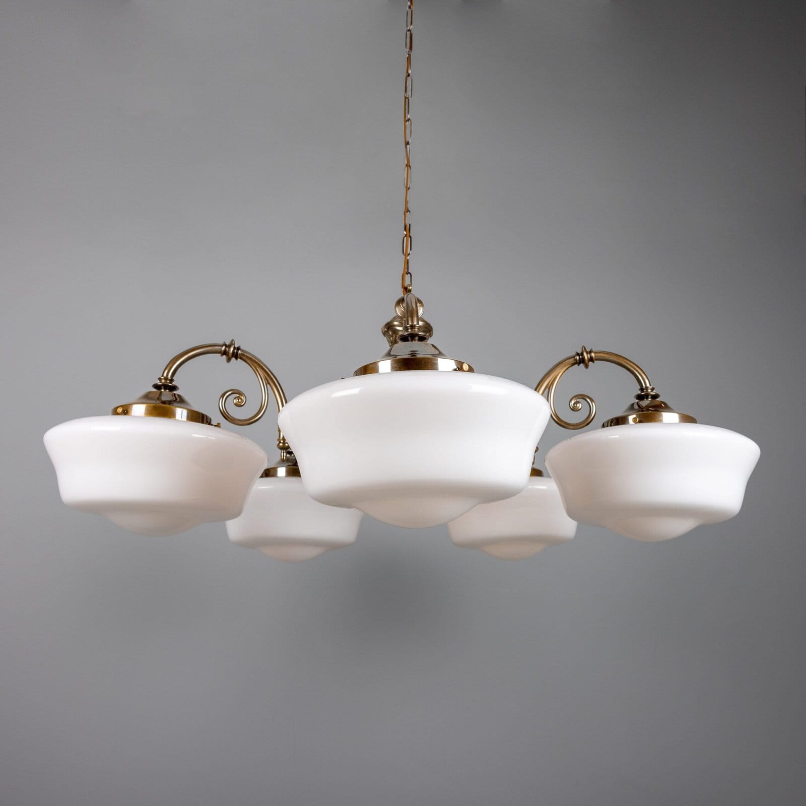 The clones 5 light schoolhouse chandelier serves as a stunning centerpiece above dining tables or in any room requiring ample illumination. Its elegance blends perfectly with modern and traditional decor alike.