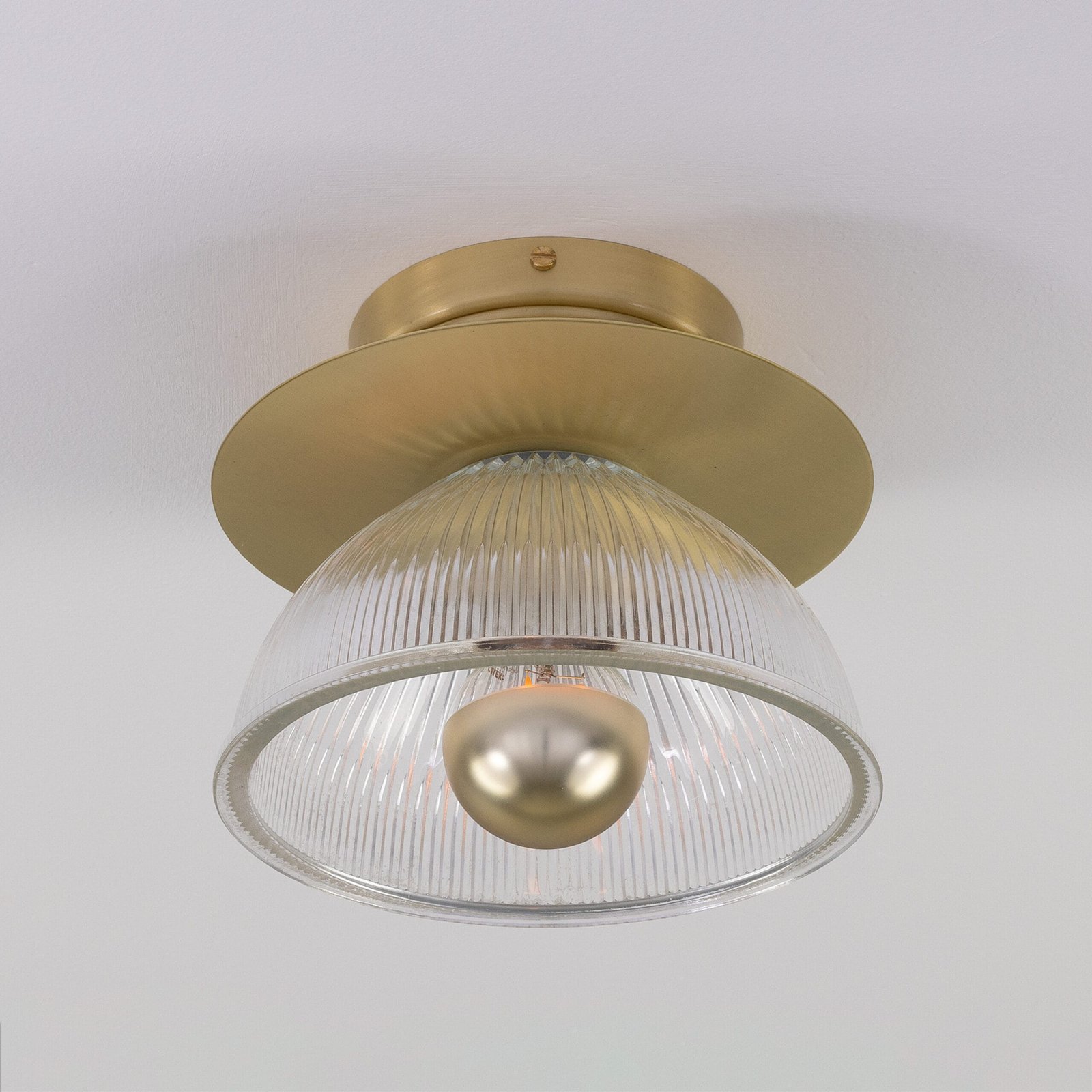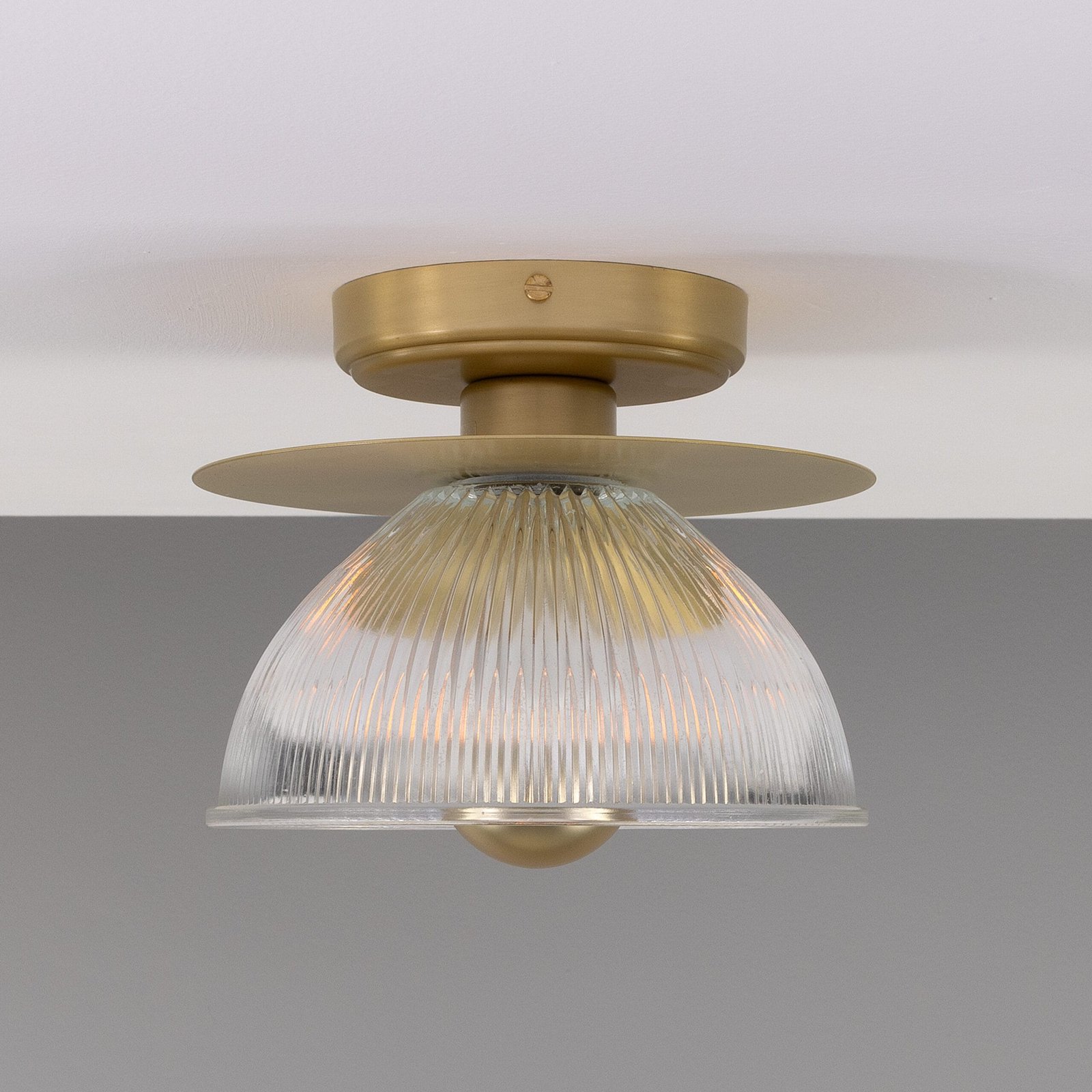 The Eclipse prismatic glass ceiling light seamlessly combines a brass disc with a unique prismatic glass shade, producing a captivating lighting effect. This statement piece not only brightens a room but also enhances its aesthetic with elegance.
