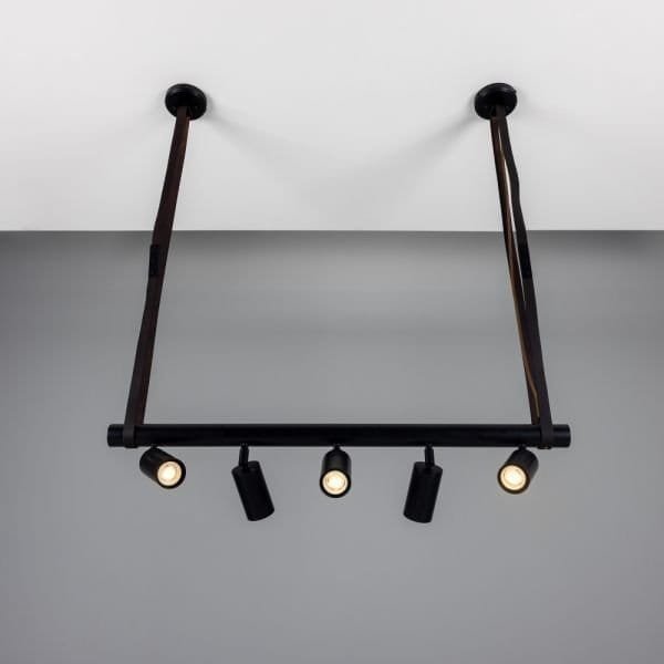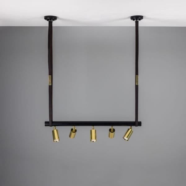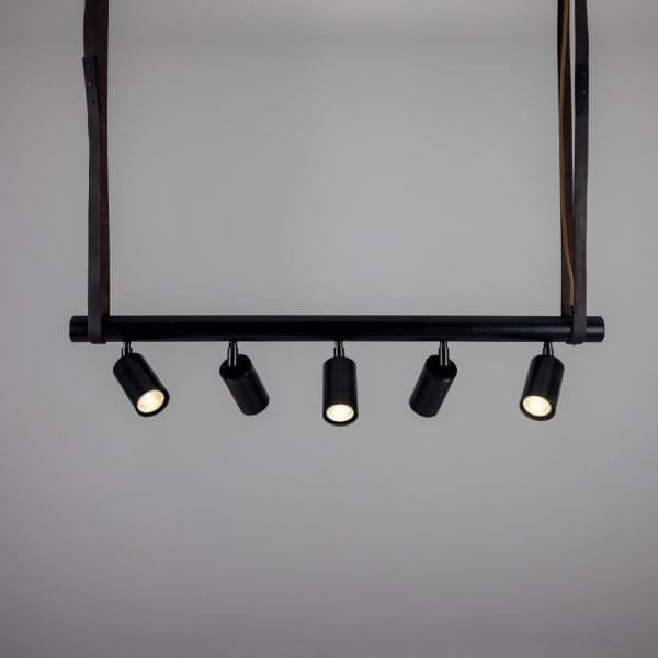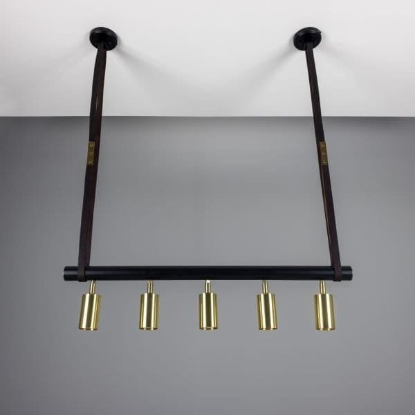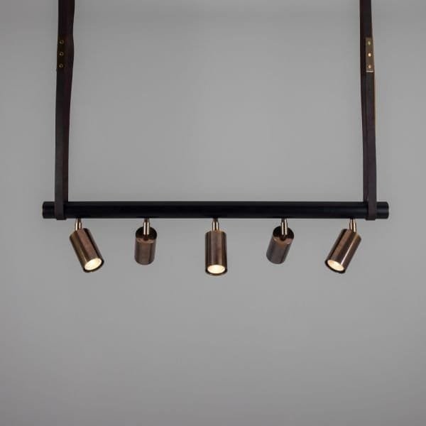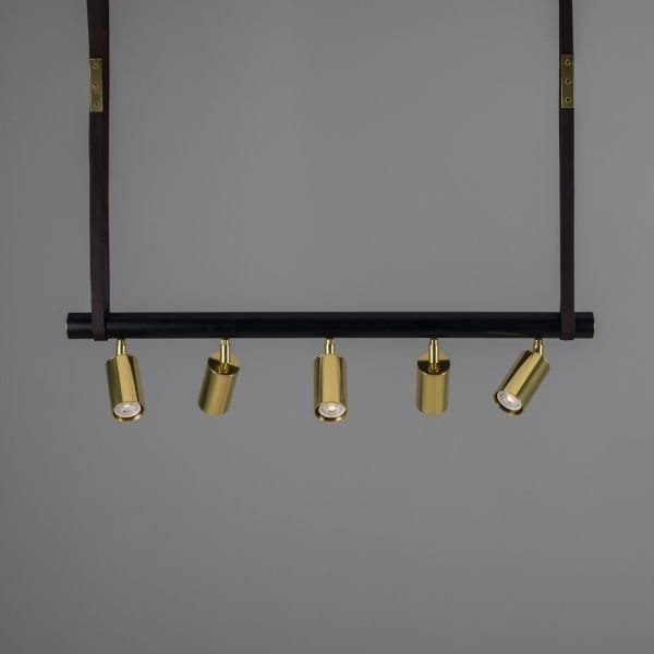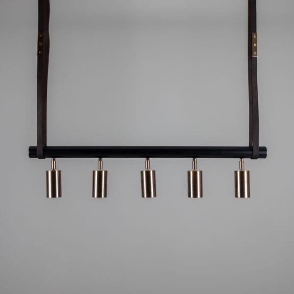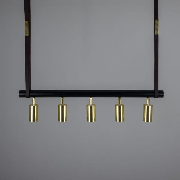 The Holmes linear pendant is a modern design featuring five cylindrical brass lights fixed to a matte black tube that can be adjusted in any direction. Suspended from two brass ceiling roses with leather straps, a matte black steel tube with brass end caps supports five directional spot lights. Housed inside each brass cylinder light is a GU10 LED bulb (sold separately). The steel tube measures 100cm in length. The Holmes linear island pendant boasts a refined design that elevates interiors, while the leather straps create an industrial edge. Versatile in its design, the five lights can be adjusted independently to provide ample task lighting in multiple directions. To complement an array of interior design styles, the Holmes linear pendant is available in six distinct finishes as standard. Those finishes are antique brass, antique silver, polished brass, satin brass, natural brass, and powder-coated matte black. The horizontal steel bar is always matte black. The Holmes linear pendant would have a unique presence suspended over a kitchen island or over a serving counter in a trendy bar.