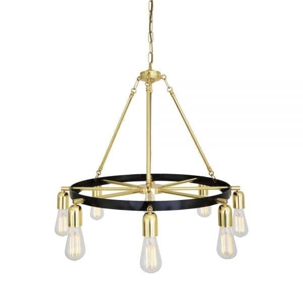 The Duleek is a modern chandelier featuring eight lamp holders around its outer ring that can be adjusted in any direction. Central to the Duleek chandelier is its 600mm black steel ring. Eight brass sleeves radiate from the centre of the Duleek chandelier and pass through and beyond its outer ring. Each brass sleeve holds a brass lamp holder on a 360ð swivel joint allowing it to be positioned in any direction. The chandelier’s black steel ring is suspended from three brass rods and chain attached to the supplied ceiling rose above. The Duleek chandelier is available in antique brass, antique silver, polished brass and satin brass. Bulbs are sold separately.