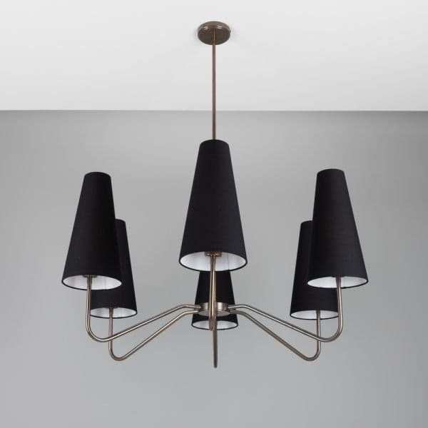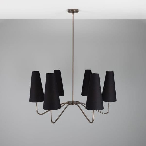 The Para chandelier is a refined, modern design with six arms that each support a tall, narrow fabric lamp shade. A central brass tube descends from the ceiling rose, holding a cylindrical centre with six arms extending horizontally. Each brass arm curves elegantly, supporting a tall, narrow fabric shade. With a simple, modern design, the Para chandelier dresses interiors beautifully while casting light through its fabric shade. To complement an array of interior design styles, the Para chandelier is available in five distinct finishes: antique brass, antique silver, polished brass, satin brass and powder-coated matte black. The fabric shades are available in black or white. With an impressive profile, the Para chandelier measures 107cm in diameter and 113cm in height. The Para chandelier would be suited to modern living rooms and hallways, as well as upscale hotels and restaurants. Bulbs are sold separately.