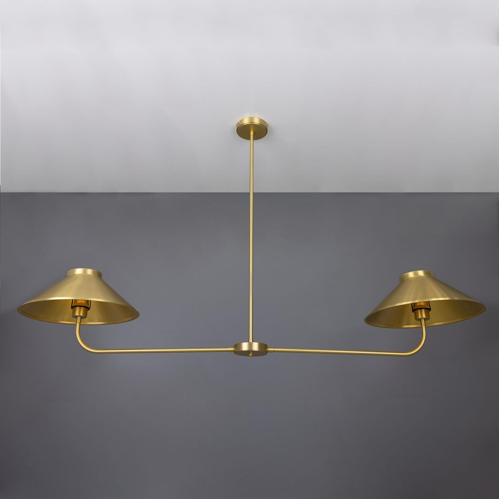 Introducing the Princeton 2 Arm Island Chandelier, a stunning fusion of contemporary aesthetics and timeless elegance. Ideal for modern homes, this chandelier features a central brass tube that gracefully descends from the ceiling rose, seamlessly connecting to a cylindrical centre. The chic design is further enhanced by two elegantly curved brass arms, each topped with a refined brass lamp shade, offering both illumination and style.