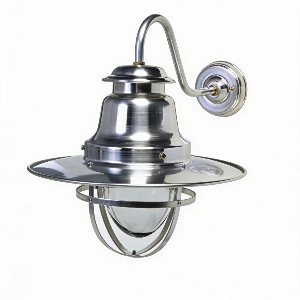 This Quayside nautical wall light combines traditional maritime design with British craftsmanship. Hand-spun from aluminium at J D Burford’s South Wales workshop, each light features the distinctive metal-protected glass dome. Supplied in raw aluminium for an industrial look.