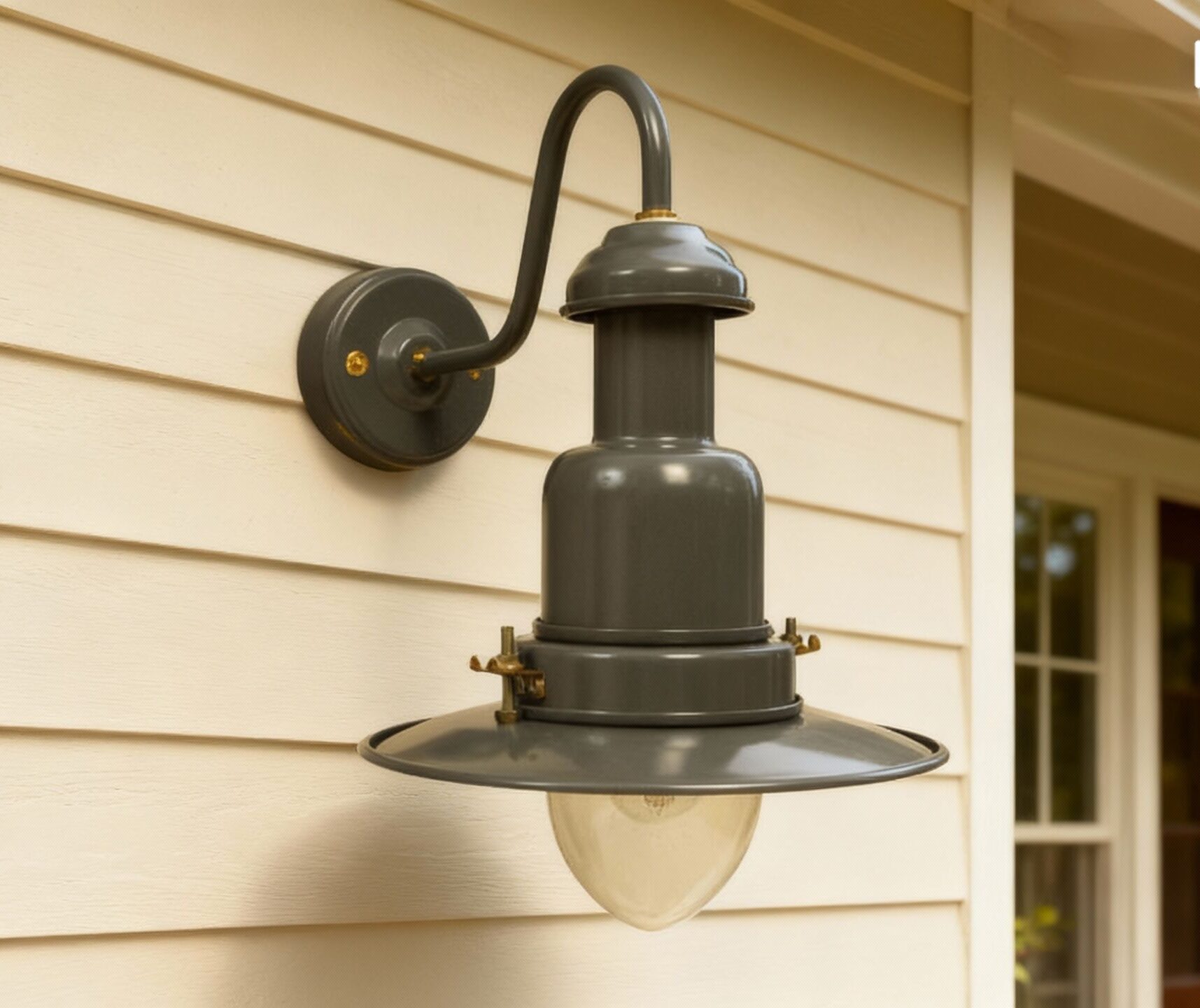 This standard fisherman’s wall light is hand-spun from aluminium at J D Burford’s South Wales workshop, then powder coated in slate grey for exceptional outdoor durability. Each light features the distinctive nickel securing nuts and glass dome that define authentic fisherman’s lighting, crafted using traditional methods honed since the 1950s.